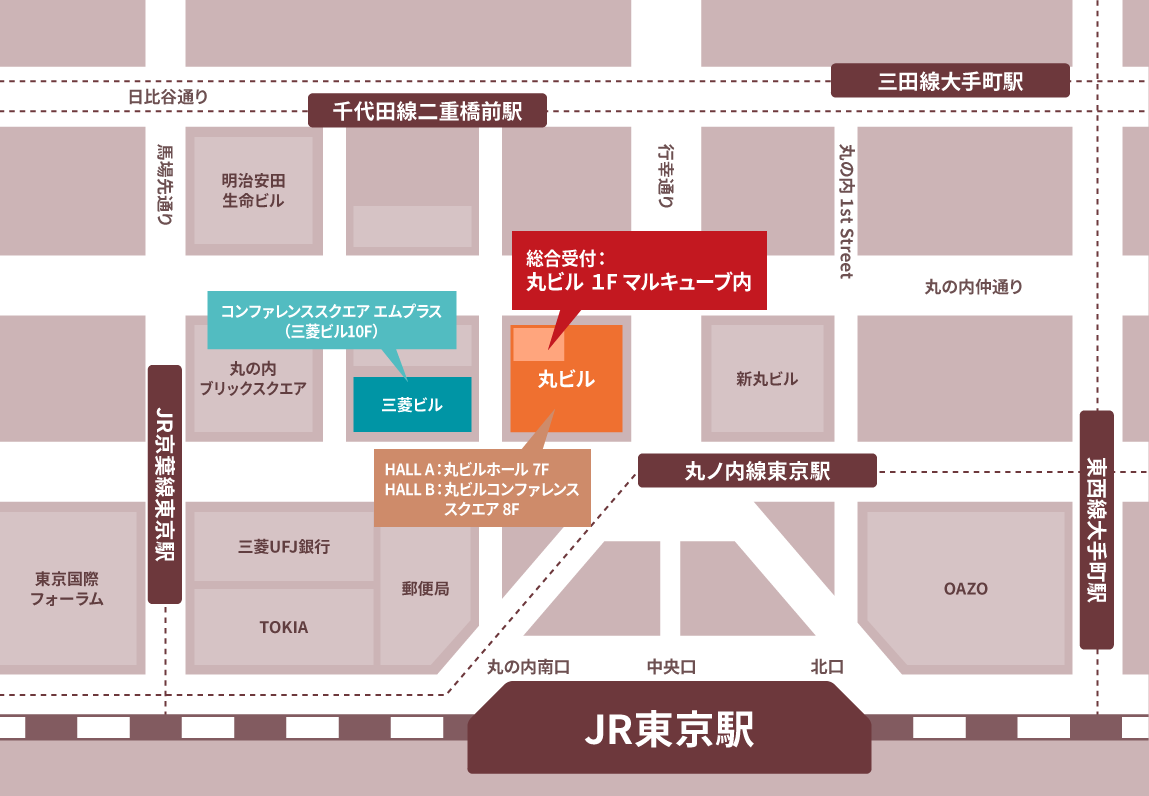 丸ビルホール(丸ビル7階)、丸ビルコンファレンススクエア(同8階)、マルキューブ(同1階)、三菱ビル10階 コンファレンススクエアエムプラス(M+)